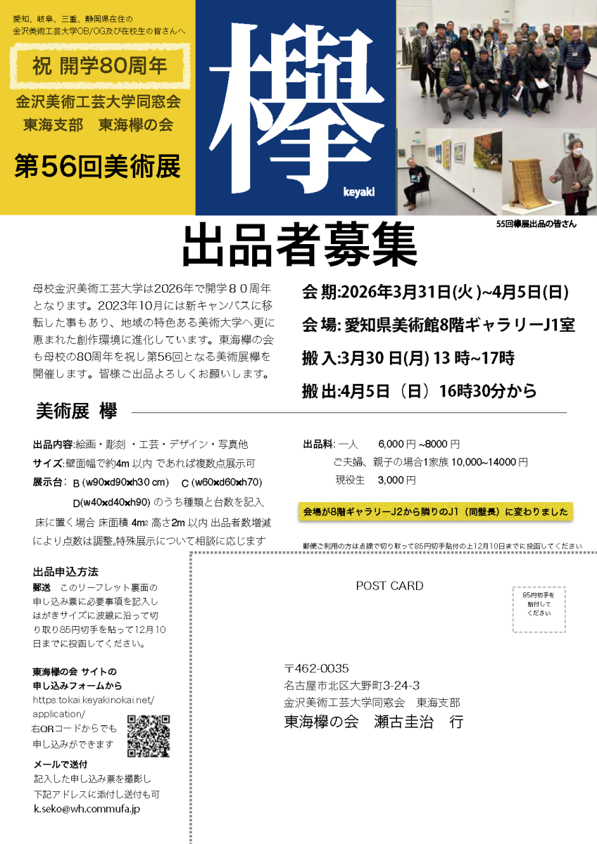 第56回美術展欅を開催のご案内です。2026年11月には金沢美大開学80年を迎えます。今回の... -